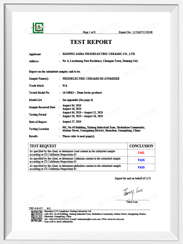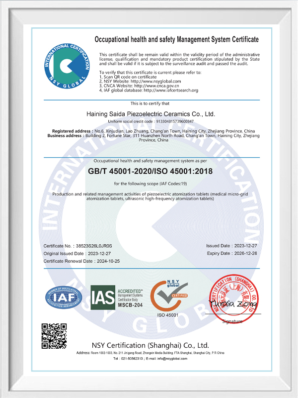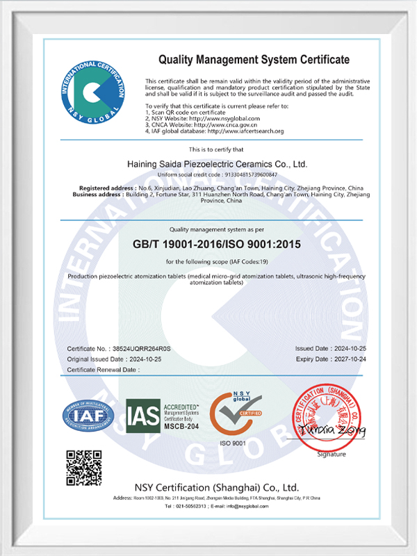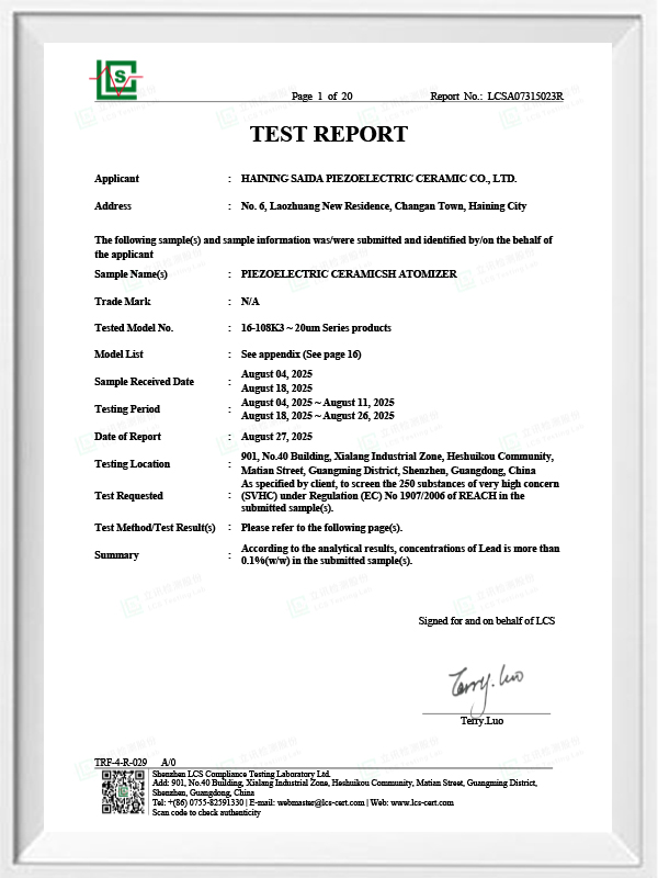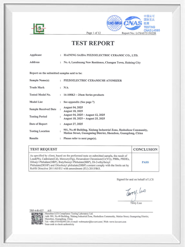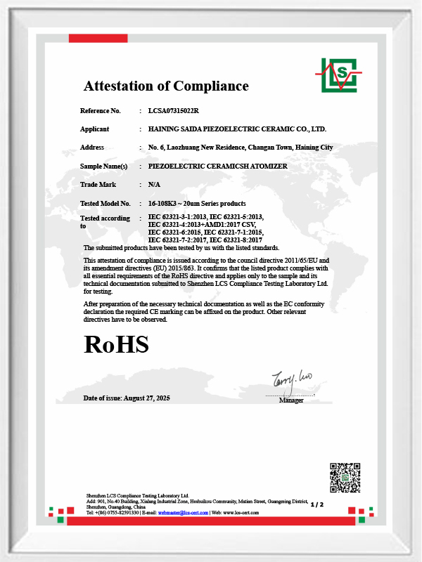 رذاذ الموجات فوق الصوتية هو جهاز يستخدم مبدأ الاهتزاز بالموجات فوق الصوتية (تحويل الطاقة) لتحويل السائل إلى قطرات صغيرة. مبدأ العمل هو الخواص الكهرضغطية الفريدة للسيراميك الكهروإجهادي للقرار، قطعة الانحلال في استلام مطابقة إشارة المجال الكهربائي، ستنتج تردد التذبذب المقابل، من خلال دور الاهتزاز عالي التردد للتجويف السائل الذي يتم التخلص منه بعيدًا عن سطح الماء لإنتاج نوع من جزيئات ضباب الماء، متناثرة مع عدد كبير من الأيونات السالبة وجزيئات صغيرة من الجزيئات، يمكن تحقيق زيادة في الرطوبة المحيطة، ودور الهواء النقي. سطح الرذاذ مطلي بالمينا الزجاجية عند درجة حرارة عالية تصل إلى 800 درجة لحماية الأقطاب الفضية للصفيحة الكهرضغطية، وزيادة مقاومة الأحماض والقلويات ومقاومة الأكسدة للرذاذ، وزيادة عمر خدمة الرذاذ. يستخدم على نطاق واسع في أجهزة الترطيب الداخلية وأجهزة تنقية الهواء وعلاج البخاخات الطبية وسيارات التجميل وغيرها من المجالات، ولكنه مناسب أيضًا للمستودعات والمصانع والترطيب والتطهير لخلق جو من معدات الترطيب. تستخدم أقراص الضباب بشكل رئيسي في الترطيب الصناعي، والتعفير الطبي، والتعفير بالروائح العلاجية، والترطيب البيئي، وضباب الحديقة وغيرها من المشاهد.